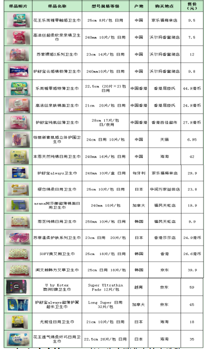 據(jù)前期調(diào)研發(fā)現(xiàn),國外品牌衛(wèi)生巾更受女性消費者青睞,很多消費者認為國外品牌衛(wèi)生巾質(zhì)量更優(yōu)更值得信賴,進而選擇跨境或海淘等方式購買國外產(chǎn)品。因此,本次樣品分別從深圳商超、香港、線上海淘購買樣品進行測試和比較,樣品涉及11款國外原裝產(chǎn)品。詳見下表。