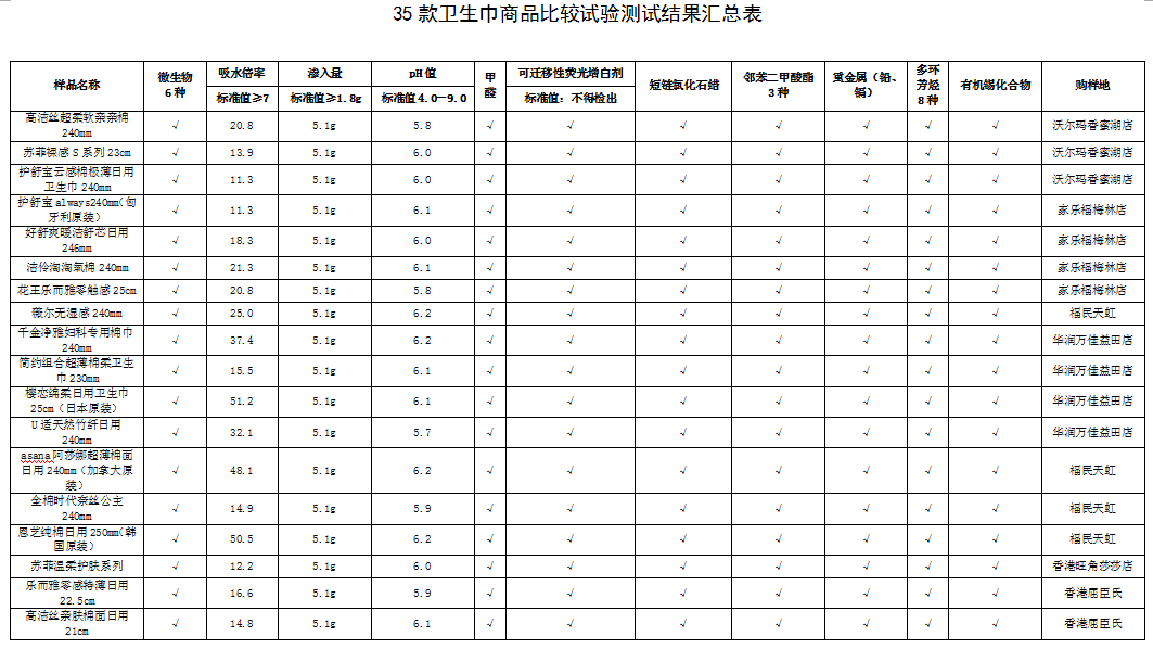 試驗結(jié)果表明參與比較試驗的35款衛(wèi)生巾產(chǎn)品,從安全指標方面來看未檢測出超標問題;使用性能指標方面也均達到測試標準,女性消費者可放心選購。