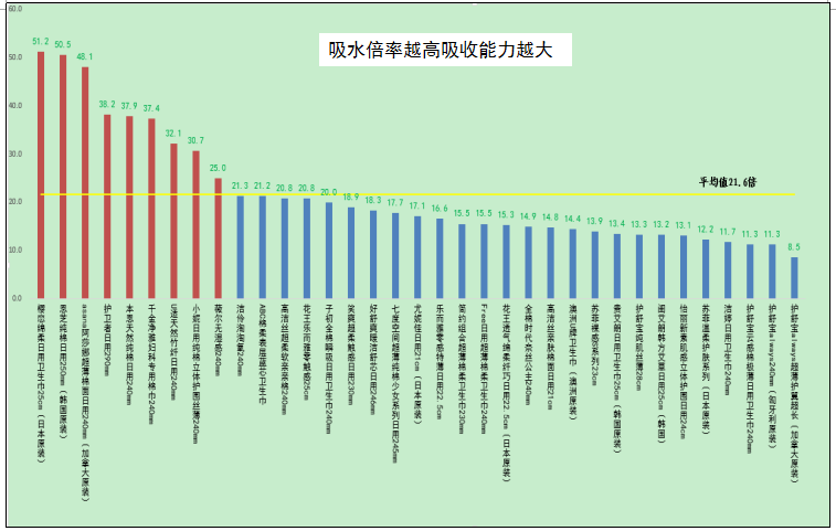 測試結(jié)果顯示,35款衛(wèi)生巾樣品吸水倍率最高達到51.2倍(櫻戀綿柔日用衛(wèi)生巾,日本原裝),最低為8.5倍(護舒寶always超薄護翼超長,加拿大原裝)。對于需要解決經(jīng)期量多量大問題的女性消費者可以優(yōu)先選擇吸水倍率高的衛(wèi)生巾商品。無論選擇哪種吸量衛(wèi)生巾,婦幼保健醫(yī)生建議,衛(wèi)生巾最佳更換時間為2-3小時。測試結(jié)果詳見下圖。