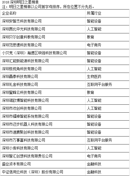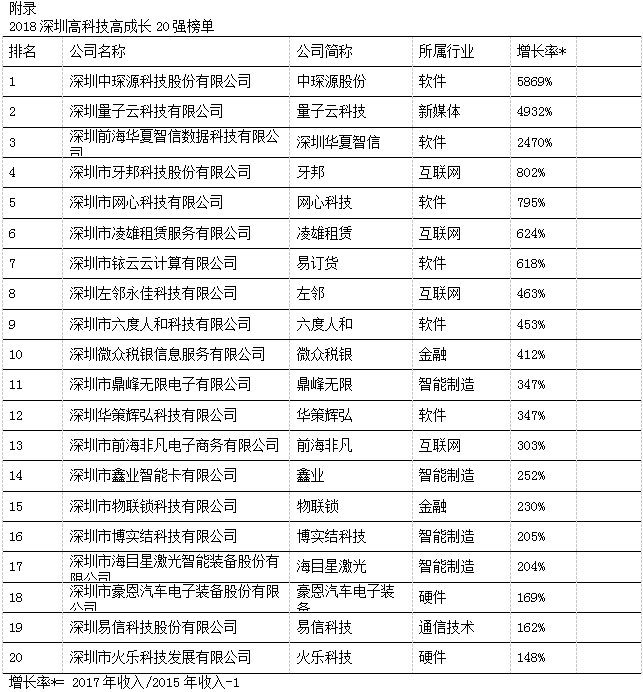 今年,榮登“深圳20強”三甲的獲獎企業(yè)分別為深圳中琛源科技股份有限公司、深圳量子云科技有限公司和深圳前海華夏智信數(shù)據(jù)科技有限公司,他們在過去三年中表現(xiàn)出的平均增長率分別為5,869%、4,932%和2,470%。本年度入選“深圳20強”的企業(yè)除了軟件、硬件、互聯(lián)網(wǎng)和通訊技術外,也不乏其他新興領域,如新媒體、智能制造和金融科技。此外,為表彰深圳市當?shù)乇憩F(xiàn)優(yōu)秀且極具潛力的初創(chuàng)企業(yè),今年共有20家企業(yè)獲選“深圳明日之星”,它們來自多個不同的領域,包括人工智能、智能設備、電子商務、教育、生物醫(yī)藥、金融科技和互聯(lián)網(wǎng)平臺服務等 (詳見附錄)。獲選成為“深圳20強”和“深圳明日之星”的企業(yè),將自動成為“中國高科技高成長50強”(簡稱“中國50強”)和“中國明日之星”的候選企業(yè),并在今年11月與全國其他入圍企業(yè)角逐,躋身全國增長最快、最具發(fā)展?jié)摿Φ母呖萍计髽I(yè)之列。