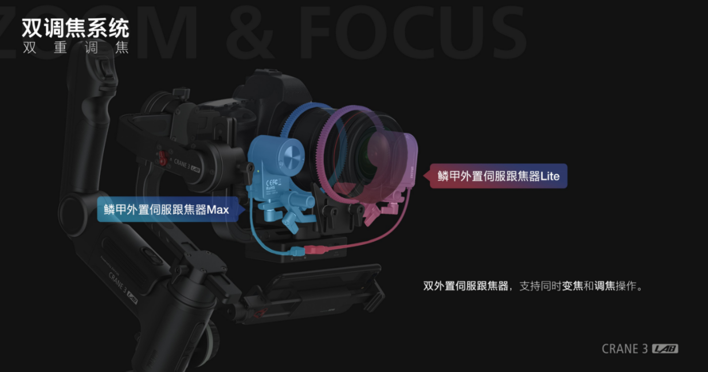 云鶴3 LAB可搭載雙外置伺服跟焦器,支持變焦和跟焦同時操作。傳統(tǒng)電子跟焦精度低,延遲高,只能兼容特定品牌的相機加鏡頭,調焦不順滑;外置伺服跟焦高精度,無延遲,對相機和鏡頭無特殊要求,調焦順滑。雙外置伺服跟焦高精度,無延遲,對相機和鏡頭無特殊要求,跟焦、變焦順滑,支持同時操作。既可以通過機器上的跟焦手輪和船型按鍵控制調焦和變焦,也可以通過ViaTouch在手機屏幕上直接控制調焦和變焦。