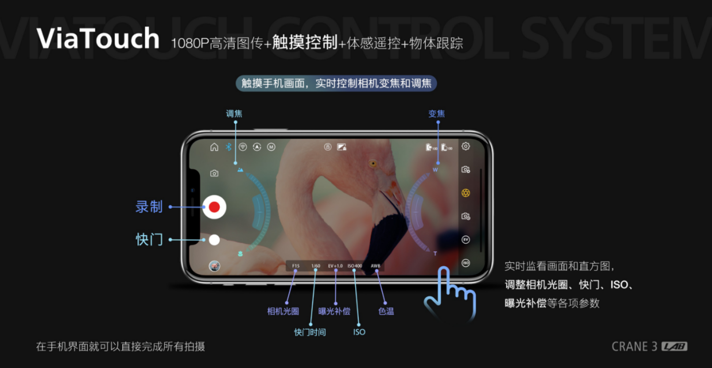 全新的ViaTouch交互功能:云鶴3 LAB搭載旗艦無線圖傳系統(tǒng),最高支持1080P的分辨率,手機、平板都能成為單反監(jiān)視屏,實時監(jiān)看畫面構圖和各項參數。在手機界面就可以直接完成所有拍攝;還能實時監(jiān)看畫面和直方圖,調整相機光圈、快門、ISO、曝光補償等各項參數。觸摸手機畫面,實時控制相機變焦和調焦。取下作為監(jiān)視器的手機,即可變身成為一臺體感遙控器,一機兩用。在手機中框選住想要追蹤的物體,穩(wěn)定器就會控制相機自動跟隨物體進行拍攝。