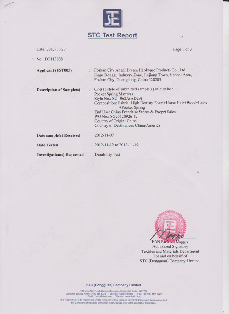 雙重?zé)崽幚砥鸬揭粋€(gè)全面消除了彈簧的內(nèi)應(yīng)力,增加抗疲勞強(qiáng)度,提高了彈性極限,使彈簧的彈性、拉力和回彈力更好,床芯不易凹塌變形,彈簧不易折斷。經(jīng)權(quán)威檢測(cè)機(jī)構(gòu)STC測(cè)試證明:嚴(yán)格按照美標(biāo)ASTM1566耐疲勞測(cè)試,西婭圖品牌床墊達(dá)到10萬(wàn)次連續(xù)錘壓不變形。(吳艷 通訊員/阿東)