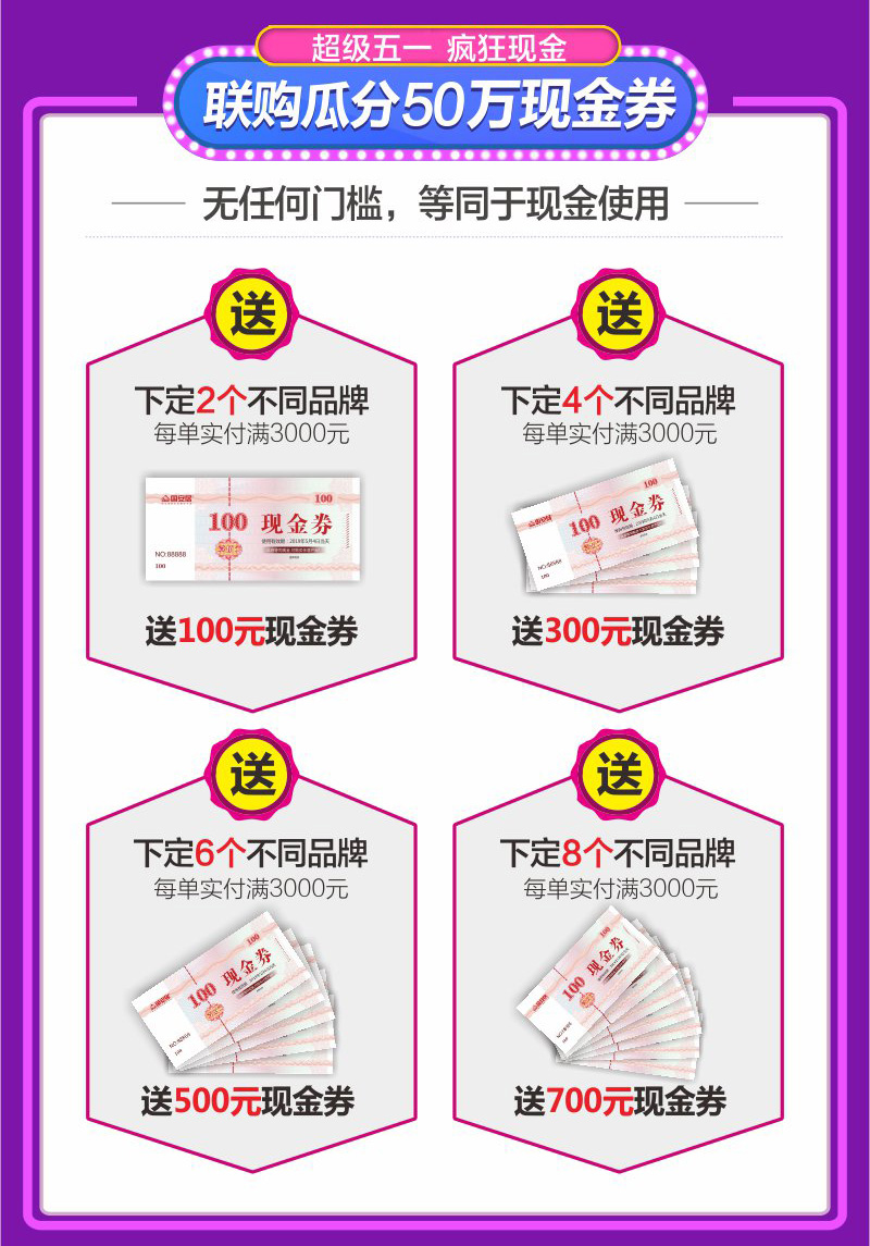 3、聯(lián)購(gòu)滿額瓜分50萬(wàn)現(xiàn)金券:5月1日-5月4日活動(dòng)期間,顧客每單實(shí)付3000元,下定2個(gè)不同品牌,即送100元現(xiàn)金券,下定4個(gè)不同品牌,即送300元現(xiàn)金券,下定6個(gè)不同品牌,即送500元現(xiàn)金券,國(guó)安居準(zhǔn)備了50W現(xiàn)金券,送完即止。