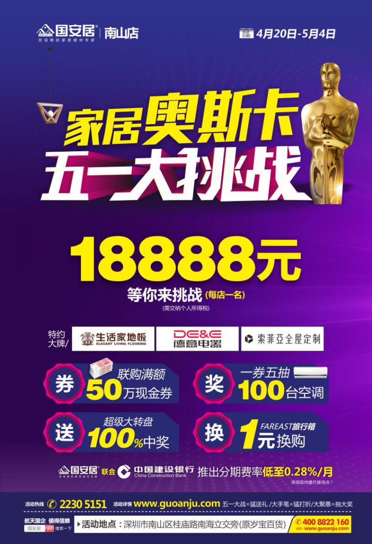 4月20號(hào)~5月4號(hào),南山國(guó)安居家居奧斯卡五一大挑戰(zhàn)盛大開(kāi)啟,一大波福利和超值優(yōu)惠來(lái)襲,準(zhǔn)備好接招了嗎?