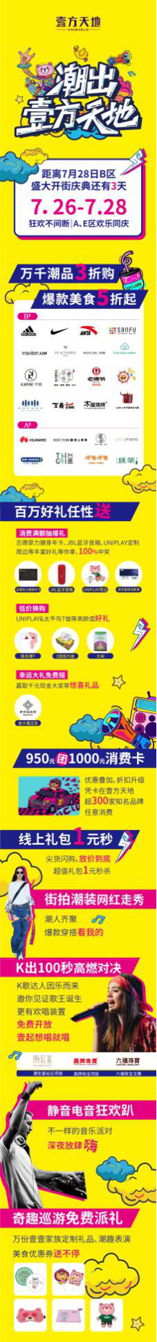開業(yè)期間,精彩紛呈的活動當然是必不可少的。7.26-7.28開業(yè)期間,B區(qū)將聯(lián)動A區(qū)、E區(qū)開展一系列活動。開業(yè)活動緊扣B區(qū)定位“潮流品味先鋒主場”,充分抓住當下年輕人愛玩、敢玩的特色,將整個壹方天地變?yōu)槌比?、炫酷的歡樂海洋。