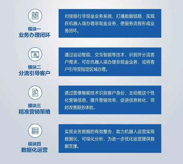 人工智能機器人與金融業(yè)務的完美結合,助力加速金融網點智能化建設、提升營銷效率、豐富金融營銷場景。