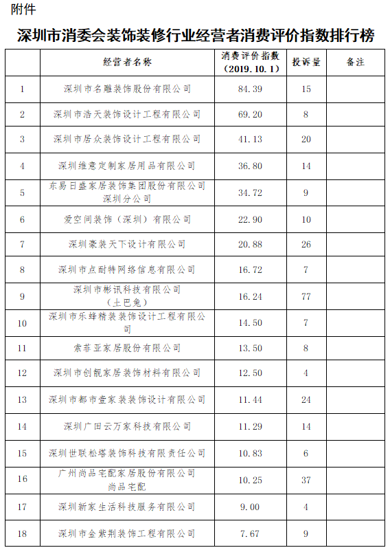 11月20日,深圳市消費者委員會(以下簡稱“深圳市消委會”)首次發(fā)布深圳市消委會裝飾裝修行業(yè)消費評價指數(shù)排行榜。榜單旨在敦促裝飾裝修行業(yè)經(jīng)營者提升商品和服務(wù)質(zhì)量,為消費者提供裝飾裝修消費指引,營造安全放心的消費環(huán)境。