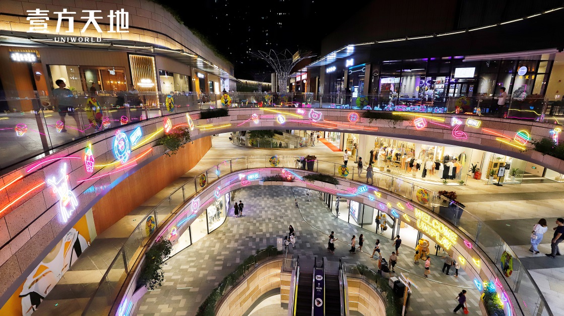 “顏值是第一生產(chǎn)力”,要打造夜間標(biāo)桿,氛圍營造必不可少。壹方天地將燈飾與建筑、綠植等多個(gè)元素巧妙結(jié)合,璀璨的景觀燈、夢(mèng)幻的星星燈、妙趣橫生的IP主題霓虹燈烘托出獨(dú)具一格的藝術(shù)氛圍。夜晚時(shí)分搭配噴泉秀和噴霧,光影夢(mèng)幻,玉壺光轉(zhuǎn),營造出極富層次感的夜景。同時(shí),通過加強(qiáng)外圍的燈光照明等,持續(xù)亮化夜間氛圍,壹方天地成為夜間休閑、聚會(huì)的絕佳場(chǎng)所?!跋M(fèi)者沒事也喜歡來走一走,享受工作之余的休閑時(shí)光。”潘燦峰說道。