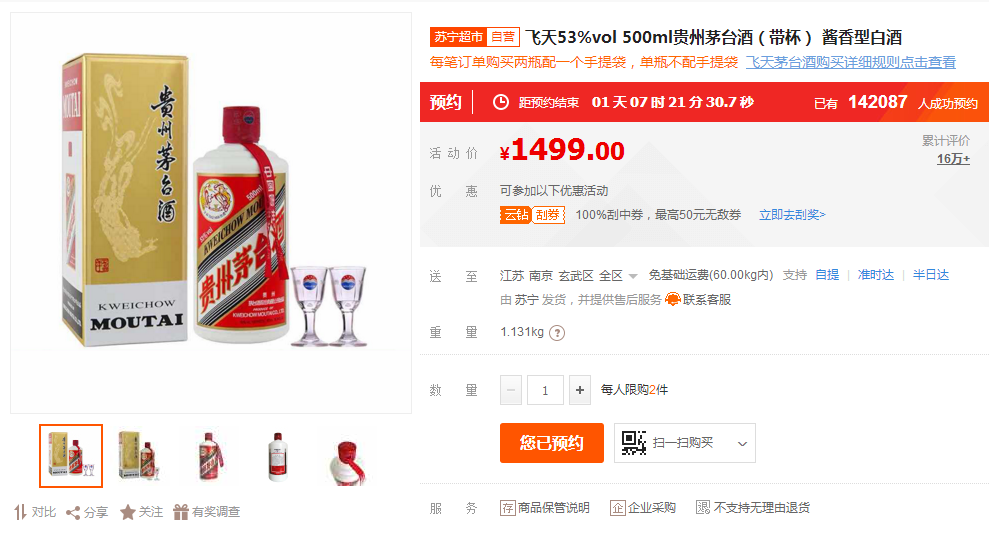 買年貨上蘇寧,買好酒上蘇寧。要說年貨節(jié)期間,蘇寧超市酒水類目的明星產(chǎn)品,還要屬1499元的飛天茅臺(tái)酒。年貨節(jié)期間,蘇寧已經(jīng)啟動(dòng)了多輪的飛天茅臺(tái)酒的預(yù)約搶購(gòu),而1月10日即將迎來新一輪的搶購(gòu)。截至1月8日上午10點(diǎn)多,已經(jīng)有超過14萬實(shí)名認(rèn)證super會(huì)員參與了本次預(yù)約。