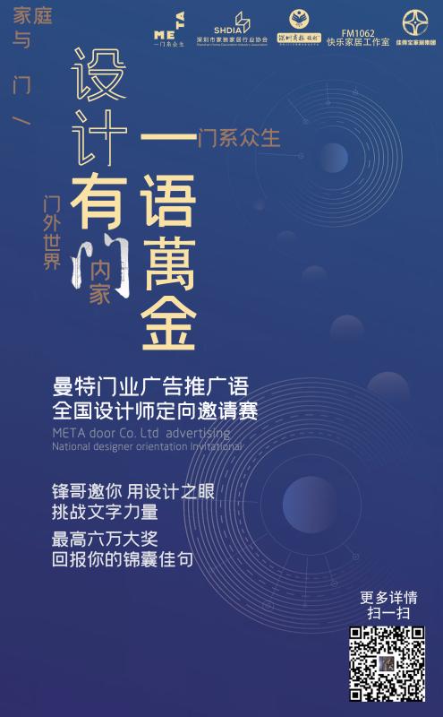 “設(shè)計(jì)有門,一語萬金”深圳市家裝家居行業(yè)協(xié)會、深圳商報(bào)、FM106.2《快樂家居》工作室聯(lián)手曼特門業(yè)舉辦的曼特門業(yè)廣告推廣語全國設(shè)計(jì)師定向邀請賽,在2020年1月1日正式啟動啦。
