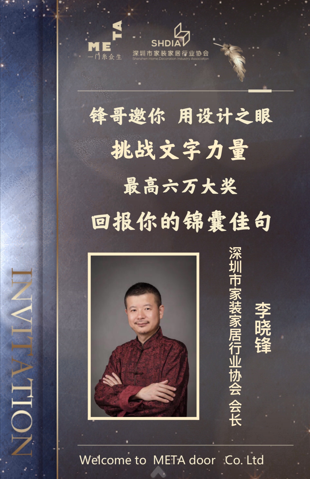 本次活動是深圳市家裝家居行業(yè)協(xié)會繼打造業(yè)內(nèi)第一個門店設(shè)計(jì)邀請賽后,策劃的又一件引起行業(yè)轟動的事情。深圳市家裝家居行業(yè)協(xié)會李曉鋒會長邀請全國家居設(shè)計(jì)師一起玩“跨”界——為曼特門業(yè)設(shè)計(jì)廣告推廣語。本次邀請賽也是業(yè)內(nèi)首次面向設(shè)計(jì)師群體的推廣語征集活動,曼特門業(yè)將用六萬大獎回報(bào)設(shè)計(jì)師的錦囊佳句。