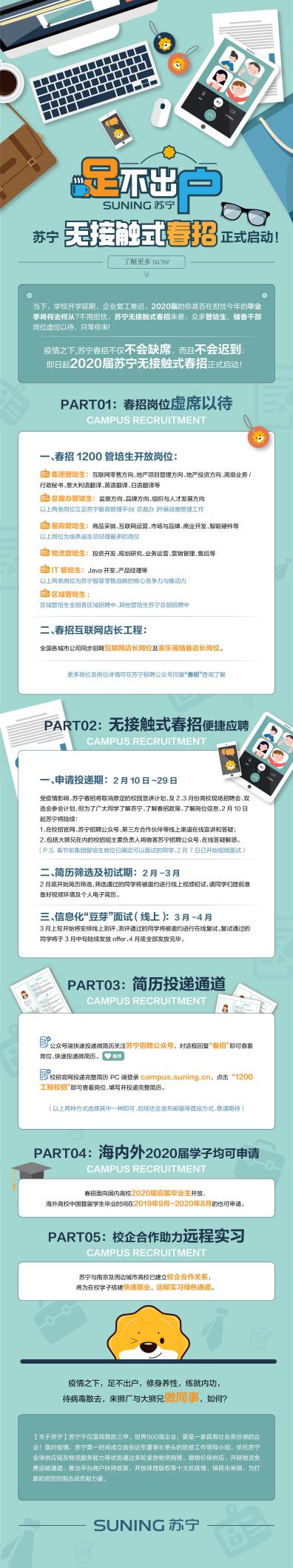 2月8日,蘇寧官方表示,疫情之下,將啟動無接觸式春招,全力保障春招正常進行。春節(jié)前確定可面試的畢業(yè)生,2月7日已陸續(xù)開始視頻面試。
