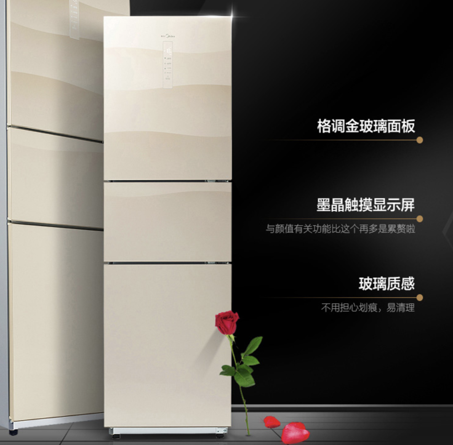 美的這款BCD-239WTGM三開門冰箱,產(chǎn)品采用金色玻璃面板與墨晶顯示屏,杜絕劃痕更有質(zhì)感,寬門設(shè)計(jì)、 隱藏暗把手、三溫區(qū)黃金比例。這款產(chǎn)品三溫區(qū)可單獨(dú)控溫,分為121升冷藏室、38升變溫室和80升冷凍室,讓儲鮮多樣化。此外,風(fēng)冷無霜減輕手動除霜的負(fù)擔(dān),保持食物原始口感。