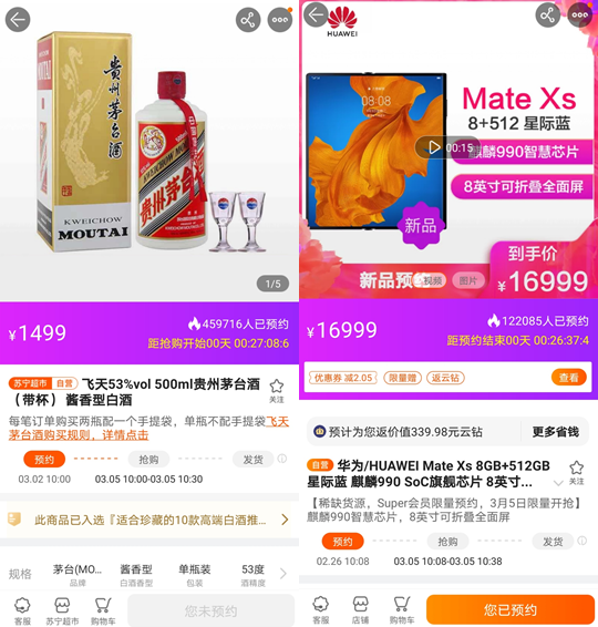 截止到開售前,蘇寧易購平臺(tái)飛天茅臺(tái)預(yù)約量將近46萬人,華為Mate Xs預(yù)約量超過12萬人,兩款高端產(chǎn)品在蘇寧易購累計(jì)預(yù)約人數(shù)達(dá)到58萬人,值得注意的是,這兩款在各自領(lǐng)域的頂尖高端產(chǎn)品,蘇寧易購SUPER會(huì)員可預(yù)約購買,8分鐘內(nèi)有58萬人瞄準(zhǔn)這兩款產(chǎn)品,并且都是一經(jīng)開售就被快速搶完,左手茅臺(tái)右手華為Mate Xs,消費(fèi)熱情不減。