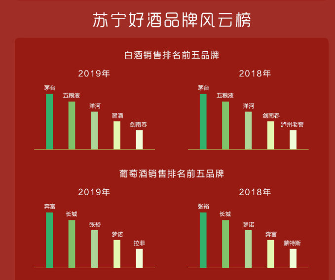 對(duì)比2018年各品牌在蘇寧的銷售表現(xiàn),則是穩(wěn)坐釣魚臺(tái)的品牌有之,長江后浪推前浪的品牌有之。具體來說,茅臺(tái)、五糧液、洋河一直牢牢占據(jù)白酒品類銷售榜前三。在紅酒方面,奔富后來者居上,從2018年的第四位躍居第一位。啤酒方面,雪花、哈爾濱、青島、百威、福佳的排名無變動(dòng),而洋酒方面,馬爹利一直穩(wěn)坐第一。古越龍山也一直是黃酒品牌銷售top1。