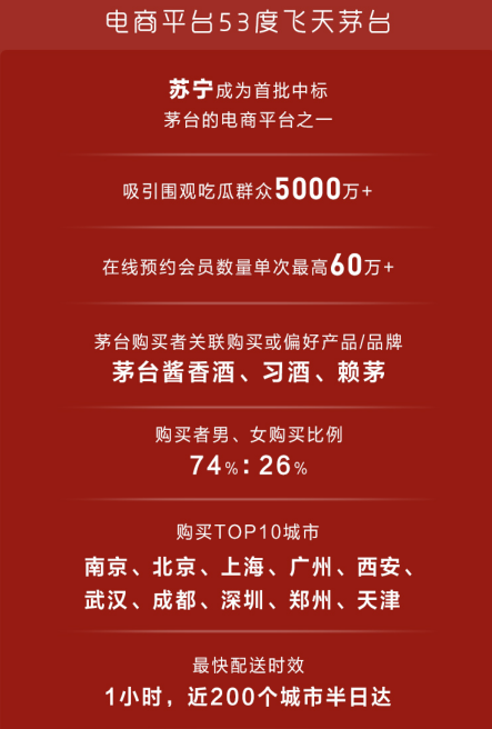 要說蘇寧酒水2019年最受歡迎的產(chǎn)品,當(dāng)屬飛天茅臺(tái)酒。去年,蘇寧與貴州茅臺(tái)完成簽約,正式成為貴州茅臺(tái)酒全國綜合類電商中標(biāo)企業(yè),并于去年10月啟動(dòng)第一批1499元飛天茅臺(tái)酒開賣。短短三個(gè)月時(shí)間,飛天茅臺(tái)酒的預(yù)約搶購頁面訪問量就達(dá)5000多萬,在線預(yù)約會(huì)員數(shù)量單次最高超過60萬。顯然,蘇寧易購已成為眾多茅臺(tái)愛好者的聚集地。近日,蘇寧又宣布將于3月20日啟動(dòng)飛天茅臺(tái)酒的每日預(yù)約、搶購,勢必將再度引發(fā)茅粉的強(qiáng)烈關(guān)注。