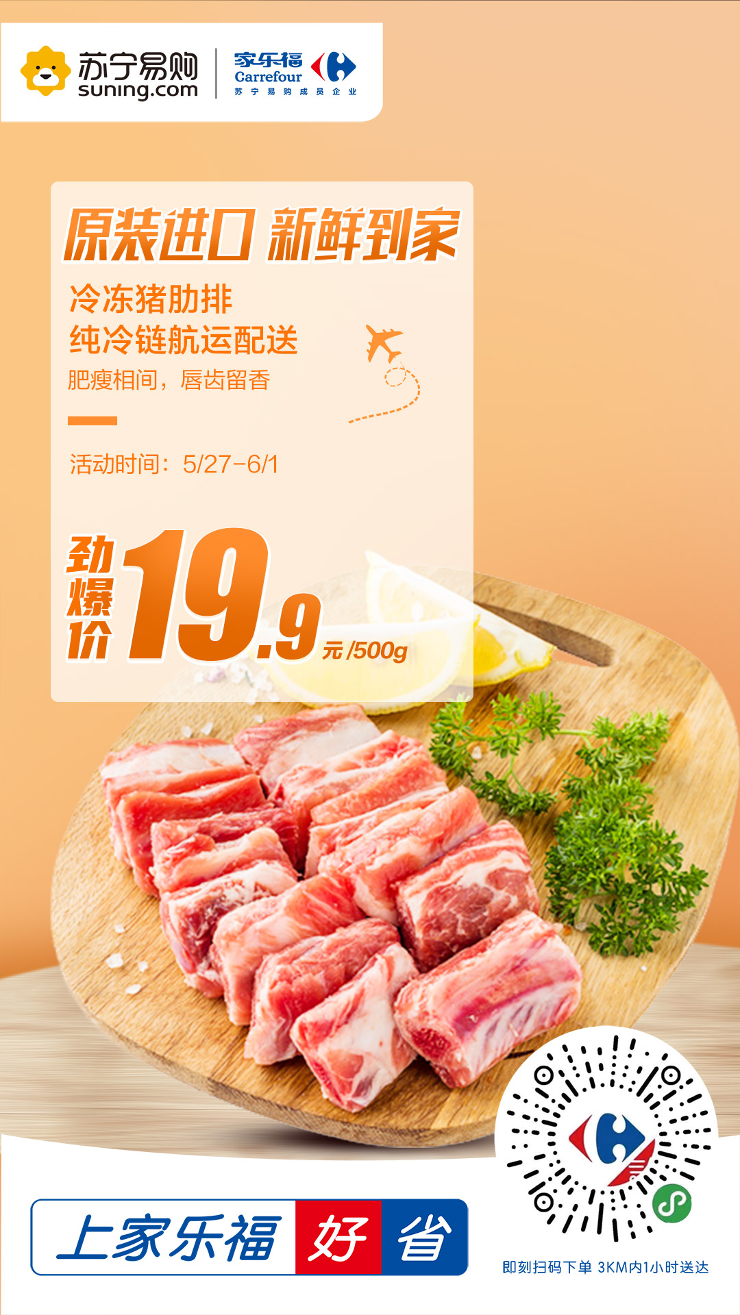 進(jìn)口冷凍豬肋排是本次活動(dòng)的主推爆品之一。生豬按照歐盟標(biāo)準(zhǔn)養(yǎng)殖,采用非轉(zhuǎn)基因飼料喂養(yǎng),全程不使用抗生素,原廠精切,采用純冷鏈航運(yùn)配送,全程可溯源。肥瘦相間,讓人唇齒留香。豬肉價(jià)格高企的背景下,這款進(jìn)口豬肋排原價(jià)39.9元/500g,活動(dòng)期間僅售19.9元/500g,價(jià)格十分惠民,絕對(duì)是秒殺爆品。此外,家樂福還準(zhǔn)備了澳洲黃牛肉36.8元/斤、帶皮后腿肉19.9元/斤、小龍蝦19.9元/盒、波士頓龍蝦+三文魚的組合預(yù)售。誠意滿滿,只為滿足“食肉獸”的大胃口!
