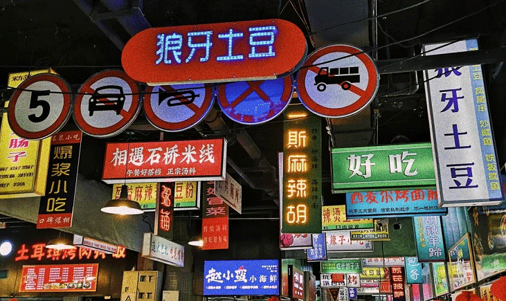 負(fù)一樓超市外yes街,統(tǒng)一的燈光亮化,霓虹夜市街景搭配美味食物,遇上“饑腸轆轆”的人群,擦出“狼吞虎咽”的火花。美食是繁榮夜市的永恒主題,品類多樣,飄香四溢,定被“吃貨”們喜愛。