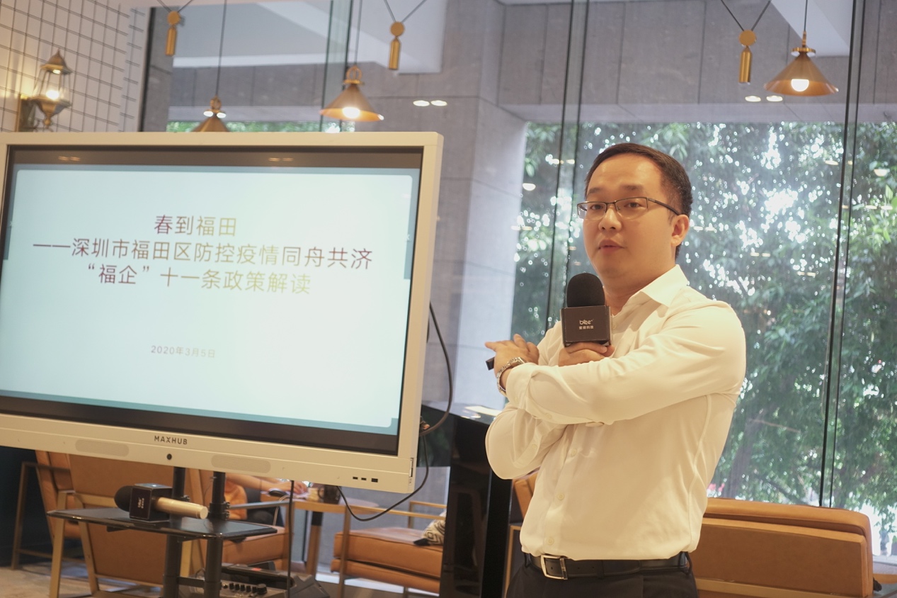 深圳市福田區(qū)財政局副局長林俊駒在分享會上指出,作為深圳最早研究提出企業(yè)復(fù)工復(fù)產(chǎn)的政府部門,深圳市福田區(qū)財政局第一時間啟動了應(yīng)急資金撥付機(jī)制和應(yīng)急政府采購機(jī)制,并快速印發(fā)工作指引,加強(qiáng)對各預(yù)算單位的業(yè)務(wù)指導(dǎo),以及對各單位和各區(qū)資金撥付的保障。據(jù)不完全統(tǒng)計,在疫情發(fā)生以來,深圳市福田區(qū)政府共投入4億多元疫情防控物資購置及醫(yī)療救治經(jīng)費(fèi)等方面。在此次分享會上,面向入駐在BEEPLUS深圳財富大廈空間的企業(yè)會員,林俊駒副局長為與會企業(yè)解讀了福田區(qū)“福企”11條及新“福企”10條政策,強(qiáng)調(diào)區(qū)政府又另行投入10億支持福田區(qū)企業(yè)克疫前行。他表示,在未來,福田區(qū)政府將繼續(xù)為創(chuàng)新創(chuàng)業(yè)類企業(yè)提供強(qiáng)有力的政策支撐,加大支持力度。