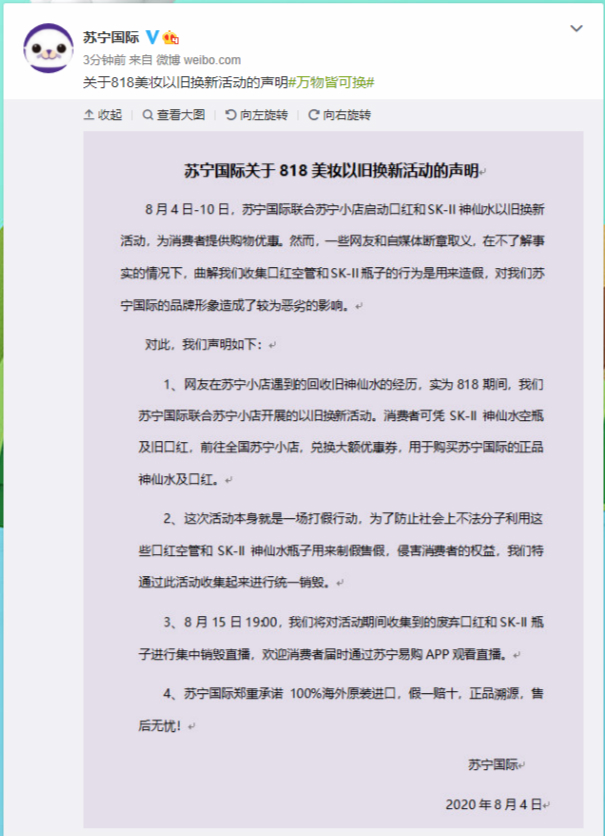 “我們的活動(dòng),原本是為了防止社會(huì)上不法分子,利用這些口紅空管和神仙水瓶子用來(lái)制假售假,侵害消費(fèi)者的權(quán)益,沒想到會(huì)被部分網(wǎng)友曲解。希望消費(fèi)者都能理性思考,獨(dú)立判斷,勿信謠傳謠。”蘇寧國(guó)際相關(guān)負(fù)責(zé)人表示。