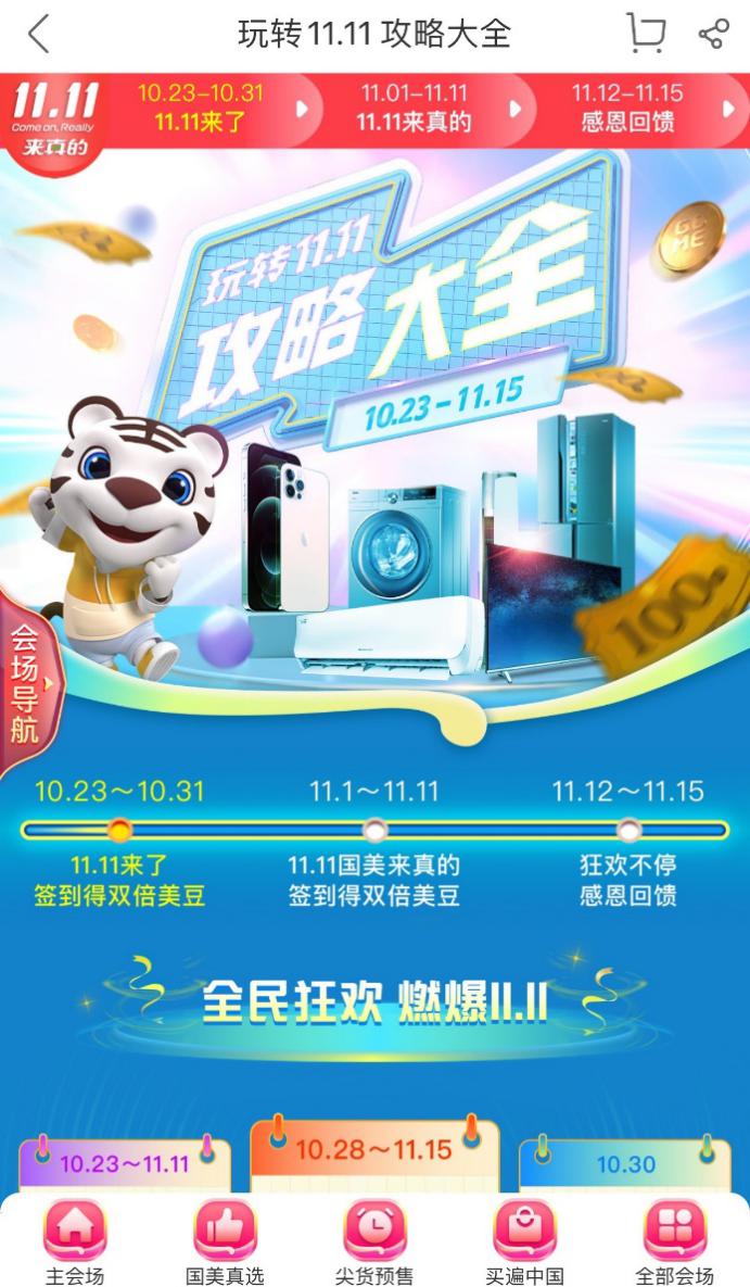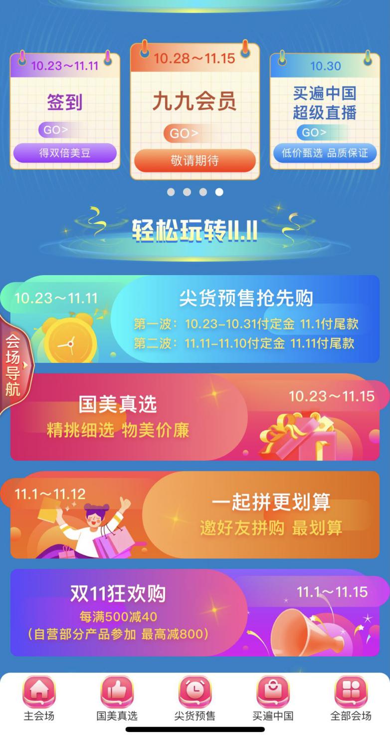 10月28日至11月25日,國(guó)美九九會(huì)員上線,只需九塊九,羊毛就能薅到手;10月30日,“買遍中國(guó)”直播杭州站開播,西湖美食便宜還好吃;11月1日-11月3日大促高峰啟動(dòng),各種紅包雨抽獎(jiǎng)嗨不停;11月4日至11月6日,萬(wàn)人直播,空前視覺(jué)盛宴奉上;11月7日至11月10日,買遍歐洲直播活動(dòng),全球好物任你挑;后續(xù)還有返場(chǎng)福利等你來(lái)拿!