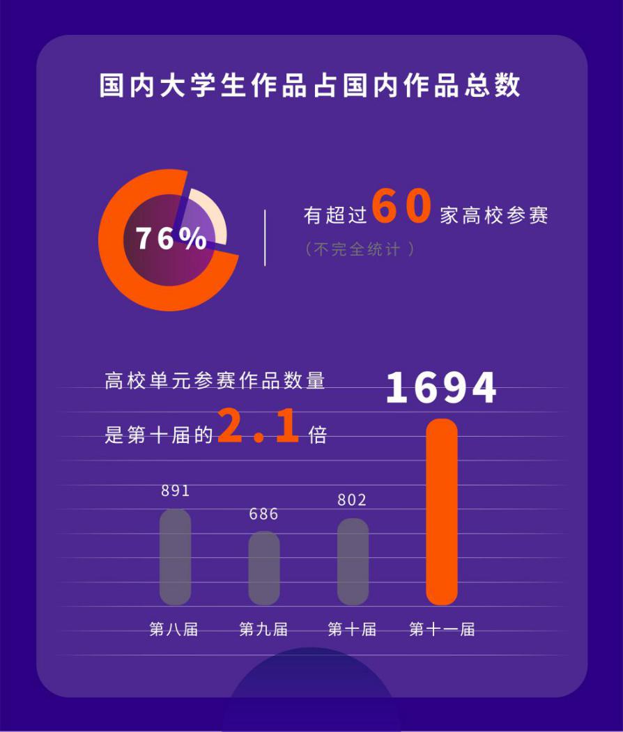 作為參與金鵬短片導(dǎo)演扶持計(jì)劃的重要力量,今年高校大學(xué)生的參賽積極性持續(xù)高漲。本屆短片節(jié)發(fā)起的“全國大學(xué)生視頻創(chuàng)意大賽”共收到來自全國超過60所高校的1694部參賽作品,數(shù)量同比增長一倍。國內(nèi)大學(xué)生參賽作品數(shù)量在所有國內(nèi)參賽作品總數(shù)中占比58%,大學(xué)生創(chuàng)作者一躍成為金鵬短片導(dǎo)演扶持計(jì)劃的中堅(jiān)力量,凸顯了新時(shí)代下年輕創(chuàng)作者對短片以及短視頻的無限熱情和興趣執(zhí)著。大學(xué)生競賽單元將分別評(píng)選出“最佳大學(xué)生短片”、“最佳大學(xué)生劇情短片”、“最佳大學(xué)生紀(jì)錄短片”、“最佳大學(xué)生動(dòng)畫短片”、“最佳大學(xué)生VLOG短片”、“最佳大學(xué)生科普短片”、“最佳大學(xué)生廣告創(chuàng)意短片”、“最佳大學(xué)生原創(chuàng)音樂短片”等9大類型入圍優(yōu)秀作品。