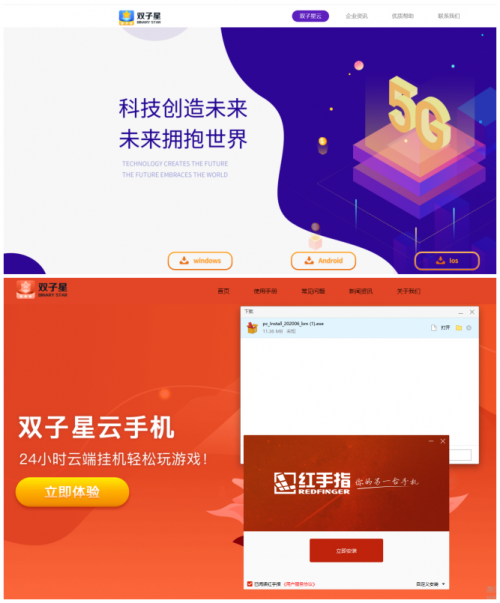 上圖為雙子星云手機(jī)官網(wǎng),下圖為紅手指仿照雙子星的官網(wǎng)