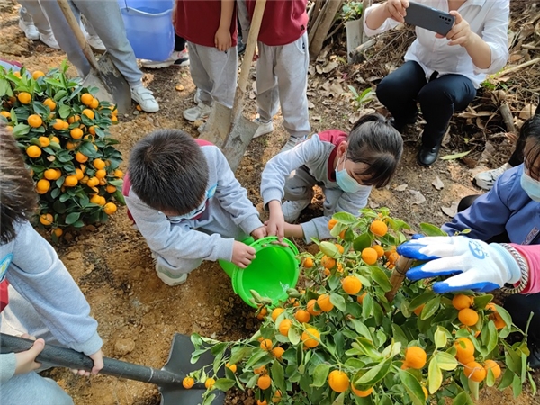 雍景城小區(qū)作為本次活動的主會場,現(xiàn)場熱鬧非凡。公明街道相關(guān)工作人員向光明區(qū)實(shí)驗(yàn)學(xué)校師生、志愿者、物業(yè)等講解年花年桔回植活動的意義及安全事項(xiàng),并分成三組開始種植活動,大家你扶綠植我培土,你摘果桔我澆水,揮灑辛勤的汗水,很快,70多棵年桔就“立”起來了,枝干上掛滿了種植人員留下的真切的寄語。東明公寓、傳麒山小區(qū)的種植現(xiàn)場同樣溫馨而快樂。