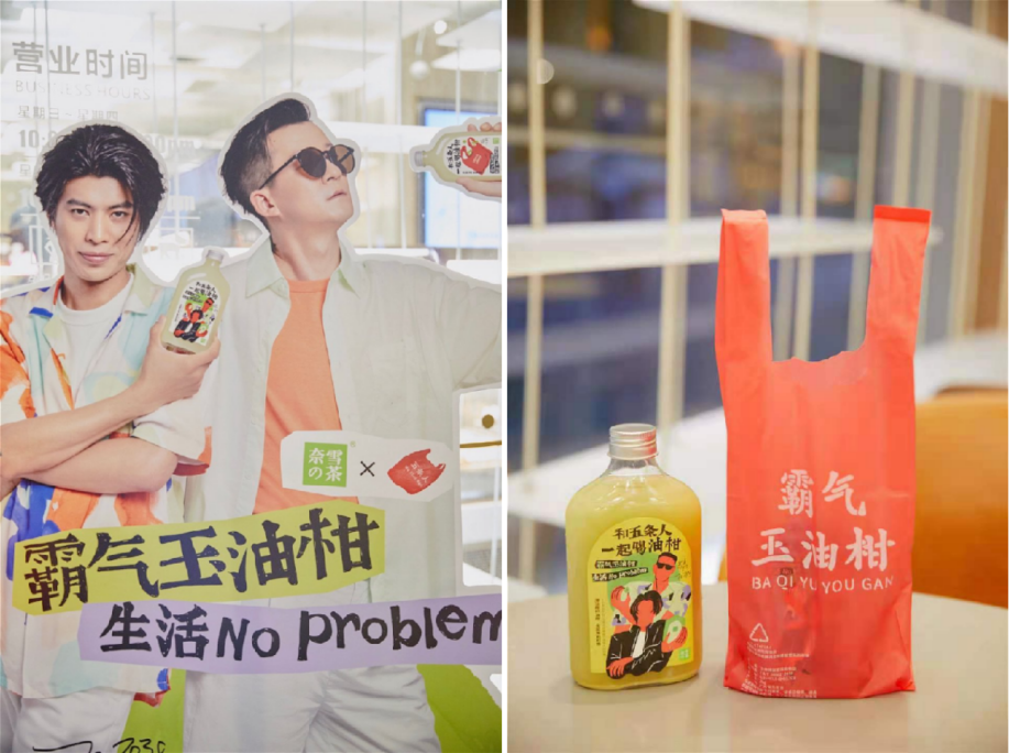 對于品牌×明星的聯名來說,調性契合是聯名活動不可或缺的"出圈基因"。而奈雪的茶霸氣玉油柑與樂隊五條人,看似來自不同次元,實則都有大膽、堅持、向上、樂觀的底色,而非將不搭嘎的兩個品牌生硬地“拉郎配”。奈雪還圍繞聯名別出心裁地推出了五條人主題的立牌、貼紙和堆頭,甚至將五條人標志性的“紅色塑料袋”做成了極具個性且生物可降解的奈雪打包袋,可謂細節(jié)之處見真章。