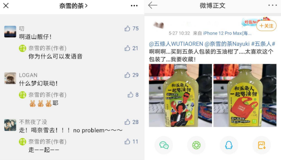 這樣“肆意妄為”的話從五條人嘴里蹦出并不稀奇,他們與生俱來的“平凡生活浪漫主義”,擅長洞察事物的另一面。精妙的是,奈雪的茶洞察到用戶在日常生活中的種種焦慮,將霸氣玉油柑“先澀后甜”的特點比作人生滋味,用這一豁達積極的態(tài)度來輕松正能量地引導,這一點與五條人的精神內核如出一轍。5月27日奈雪的茶X五條人TVC發(fā)布后,不少網友表示這波是“破次元壁”的夢幻聯動,還有網友在線分享五條人歌曲中有共鳴的歌詞。