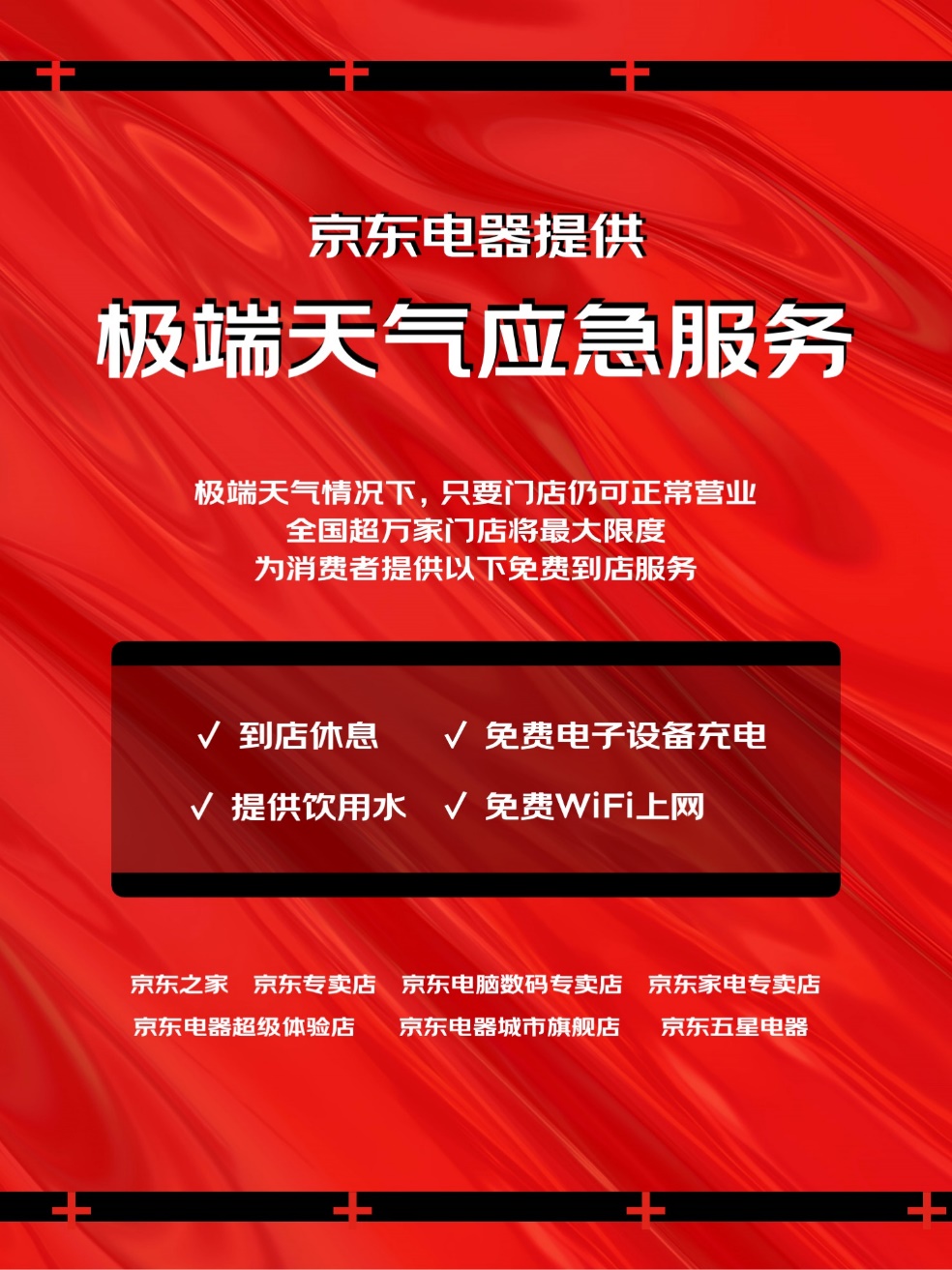京東電器第一時(shí)間推出了極端天氣應(yīng)急服務(wù),聯(lián)動(dòng)當(dāng)?shù)厝钥烧I(yíng)業(yè)的京東之家、京東專賣店、京東電腦數(shù)碼專賣店等線下門店,為市民提供汛情避險(xiǎn)場(chǎng)所和應(yīng)急服務(wù)。未來在遇到極端天氣的情況下,京東電器在全國(guó)的線下門店,包括京東之家、京東專賣店、京東電腦數(shù)碼專賣店、京東家電專賣店、京東電器超級(jí)體驗(yàn)店、京東電器城市旗艦店、京東五星電器等門店只要仍可正常營(yíng)業(yè),將最大限度為附近的消費(fèi)者提供到店休息、飲用水、電子設(shè)備充電、 WiFi上網(wǎng)等免費(fèi)應(yīng)急服務(wù)。