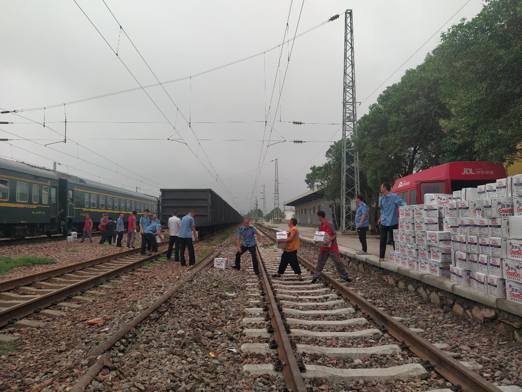 在第二批物資車隊(duì)駛出倉庫的同時(shí),第三批滿載540多箱食品和礦泉水的京東物流車涉水抵達(dá)K226/7次列車臨時(shí)??康泥嵵蓁F爐站,為仍在滯留的數(shù)百名旅客送去應(yīng)急物資。