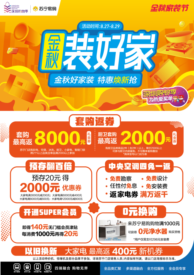 而9月9日到9月12日期間,蘇寧易購將開啟涉及全品類的金秋家裝節(jié),并且將會聯(lián)合海信一起開啟909嗨購盛典,屆時不僅會有大牌匯聚,福利補(bǔ)貼,還將會有家裝品牌共同加入,聯(lián)手提供一站式裝修解決方案,一同為消費(fèi)者避開家裝過程中的那些坑。同時深圳購物季也在持續(xù)進(jìn)行中,蘇寧易購作為指定電商平臺,為深圳市提供了一億元的消費(fèi)補(bǔ)貼,消費(fèi)者在深圳市蘇寧易購門店參與以舊換新活動,大家電產(chǎn)品最高可以補(bǔ)貼400元,手機(jī)產(chǎn)品最高可以補(bǔ)貼1600元,電腦產(chǎn)品最高享受88折優(yōu)惠。另外蘇寧易購還開設(shè)了“圳品專區(qū)”,里面匯聚深圳本土大牌產(chǎn)品,折扣低至五折起。