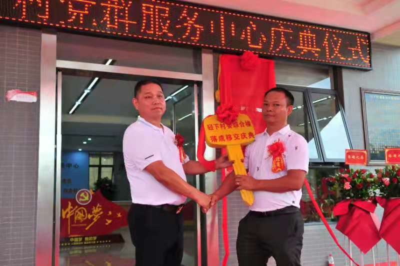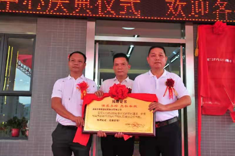 在落成典禮中,深圳安宏基控股集團有限公司彭康輝董事將大樓辦公鑰匙移交給硁下村黨支部書記彭志康。村支書彭志康、五云鎮(zhèn)慈善會會長彭志響一起贈牌匾給深圳安宏基控股集團有限公司彭康輝董事。