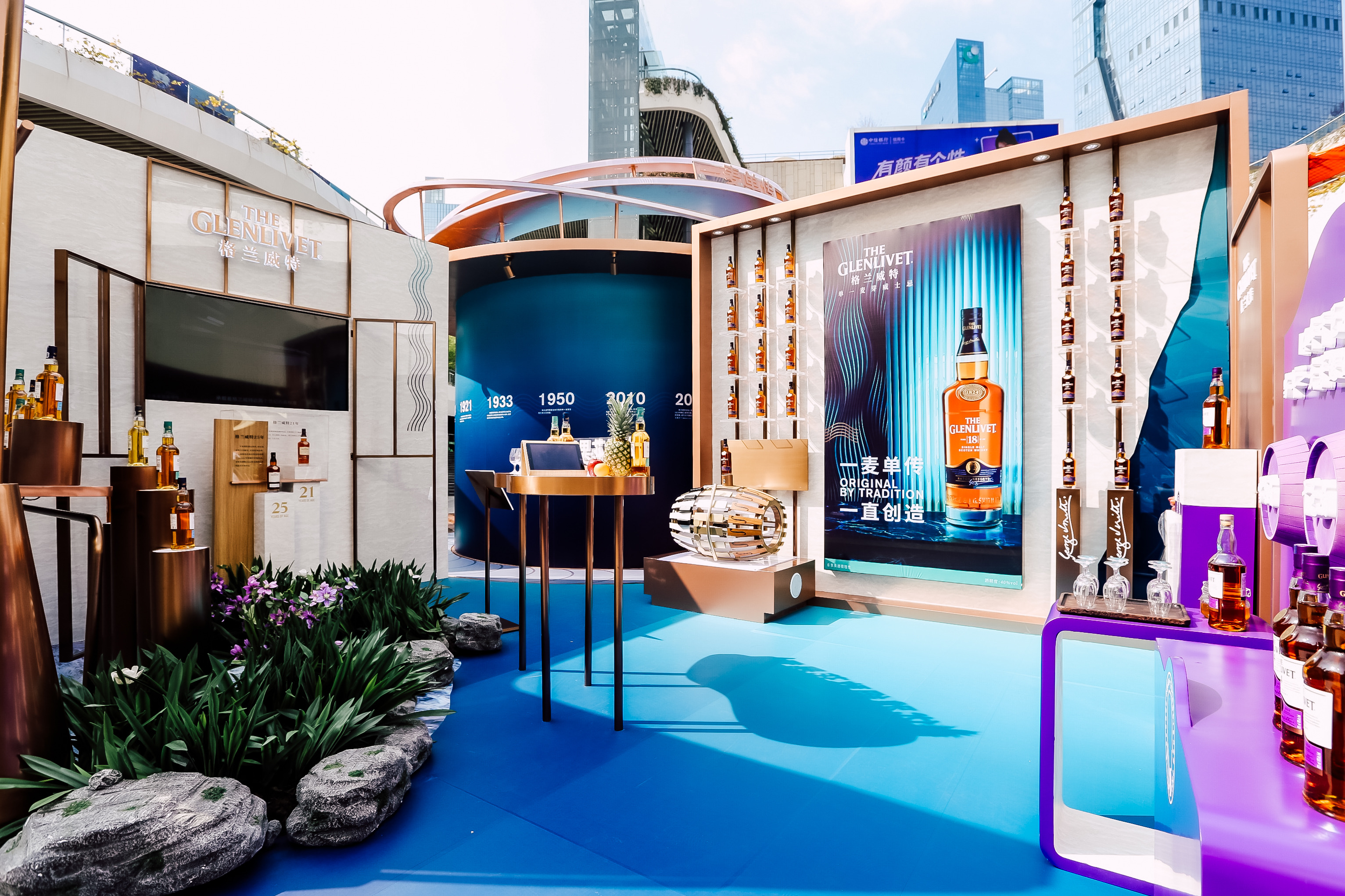創(chuàng)造不止步,格蘭威特不斷尋求產(chǎn)品革新,創(chuàng)造了以花果芬芳和馥郁口感為特色的諸多單一麥芽威士忌佳釀。步入時光穿梭酒廠的“傳承與創(chuàng)造”空間,花果芳香綻放,充滿自然氣息的環(huán)境中呈現(xiàn)了格蘭威特豐富的產(chǎn)品組合以及其獨特的優(yōu)雅細致風格??臻g一側(cè)重點展示了品牌的經(jīng)典之作——格蘭威特18年,作為醇厚均衡的單一麥芽威士忌佳釀,它是歲月與優(yōu)雅的詮釋,芳醇柔滑,酒體均衡。此外,另一款全新威士忌臻品——格蘭威特14年干邑桶陳釀也在空間另一側(cè)隆重展出。歷經(jīng)美國威士忌桶與雪莉桶至少14年的陳年之后,精選部分酒液換桶陳年于高品質(zhì)法國干邑橡木桶,格蘭威特14年干邑桶陳釀?chuàng)碛酗枬M且濃郁的甜美風味,并創(chuàng)新地將白蘭地香氣與品牌標志性的優(yōu)雅細致花果香融為一體,加上瓶身奪目的紫色設(shè)計,威士忌愛好者可以通過參與現(xiàn)場品鑒挑戰(zhàn)贏取品鑒機會,解鎖別具一格的風味之旅。