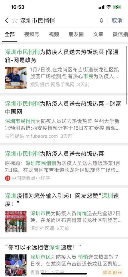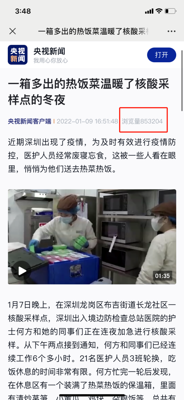 1月9日,一篇名為《一箱多出的熱飯菜溫暖了核酸采樣點(diǎn)的冬夜》的報(bào)道登上了央視新聞。在深圳全民抗疫期間,“維小飯”為核酸檢測(cè)醫(yī)護(hù)人員偷偷送上用保溫箱裝好的熱飯熱菜,獲網(wǎng)友紛紛點(diǎn)贊:你永遠(yuǎn)可以相信“深圳速度”,也永遠(yuǎn)可以相信“深圳創(chuàng)新”。央視新聞報(bào)道之后,熱度持續(xù)不減。“深廣電第一現(xiàn)場(chǎng)”“羊城晚報(bào)”“光明網(wǎng)”“中國(guó)青年網(wǎng)”等權(quán)威媒體也將此事件進(jìn)行了報(bào)道,引發(fā)眾網(wǎng)友熱議。