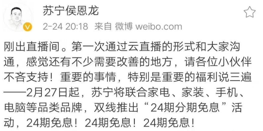 2月24日晚8點(diǎn),一場(chǎng)特殊的線上發(fā)布會(huì)在蘇寧矩陣直播平臺(tái)全面啟動(dòng)。蘇寧侯恩龍化身主播,宣布開(kāi)啟一場(chǎng)公司復(fù)工與市場(chǎng)復(fù)蘇的“救市”行動(dòng),拉開(kāi)家電銷(xiāo)售破局大幕。