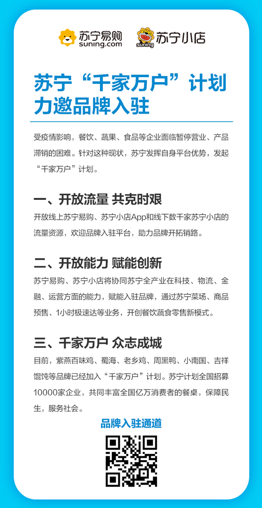 2月13日晚間,蘇寧發(fā)布“千家萬戶”計(jì)劃,開放線上APP及線下數(shù)千家蘇寧小店流量資源,邀請(qǐng)品牌入駐,共同拓展銷售渠道,加大民生消費(fèi)服務(wù)力度。