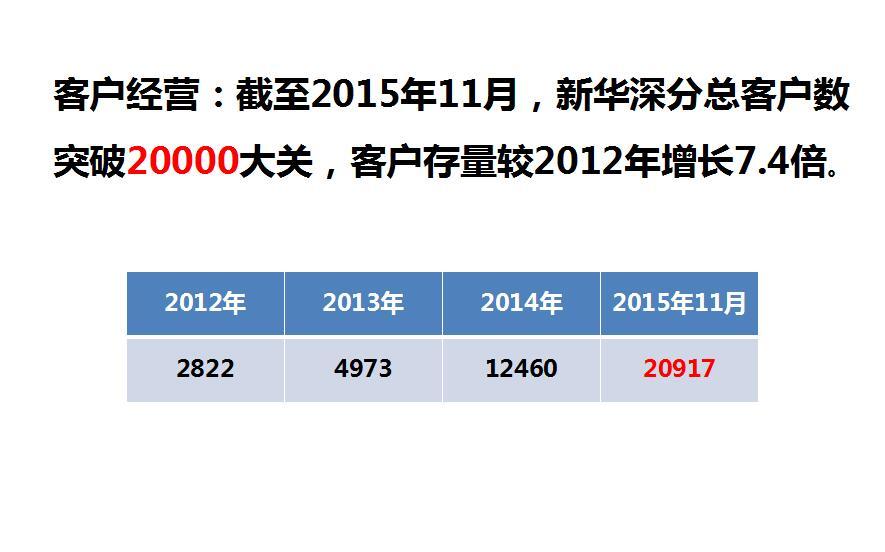 客戶經(jīng)營:截至2015年11月,新華深分總客戶數(shù)突破20000大關,較2012年增長近7.4倍。