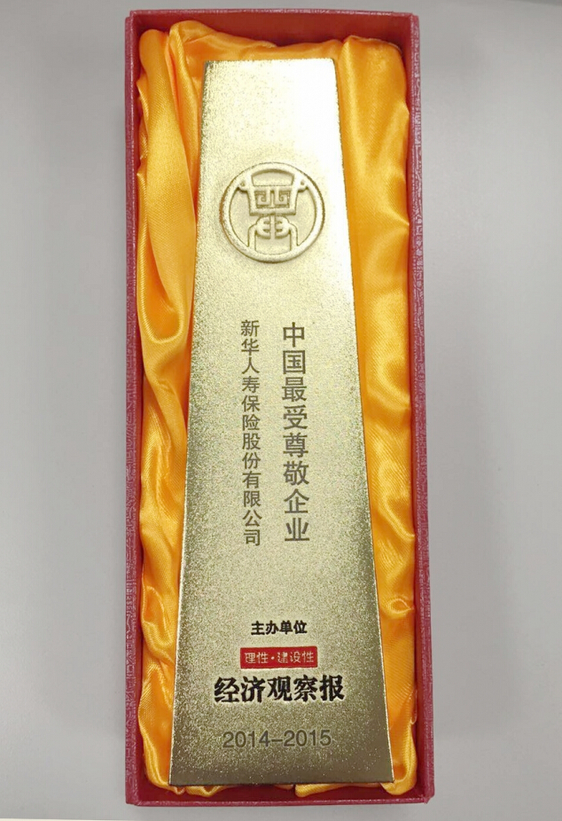 2015年7月,在經(jīng)濟(jì)觀(guān)察報(bào)主辦的2014-2015中國(guó)最受尊敬企業(yè)評(píng)選中,新華獲評(píng)“中國(guó)最受尊敬企業(yè)”獎(jiǎng)。中國(guó)綠色保險(xiǎn)最佳典范企業(yè)2015年8月,在經(jīng)濟(jì)參考報(bào)主辦的“2015中國(guó)綠色資本論壇暨中國(guó)綠色資本品牌榜”活動(dòng)中,新華保險(xiǎn)榮獲“中國(guó)綠色保險(xiǎn)最佳典范企業(yè)”。2015胡潤(rùn)品牌百?gòu)?qiáng)9月17日,胡潤(rùn)研究院發(fā)布《2015胡潤(rùn)品牌榜》顯示,新華保險(xiǎn)以120億元的品牌價(jià)值占據(jù)榜單第68名,首次進(jìn)入榜單前百?gòu)?qiáng),同比強(qiáng)勁上升51位。品牌價(jià)值漲幅高達(dá)287%,漲幅居金融業(yè)之首,且是唯一一家進(jìn)入增值品牌十強(qiáng)的金融企業(yè),顯示出新華保險(xiǎn)品牌實(shí)力的快速提升,以及公司綜合實(shí)力的顯著增強(qiáng)。