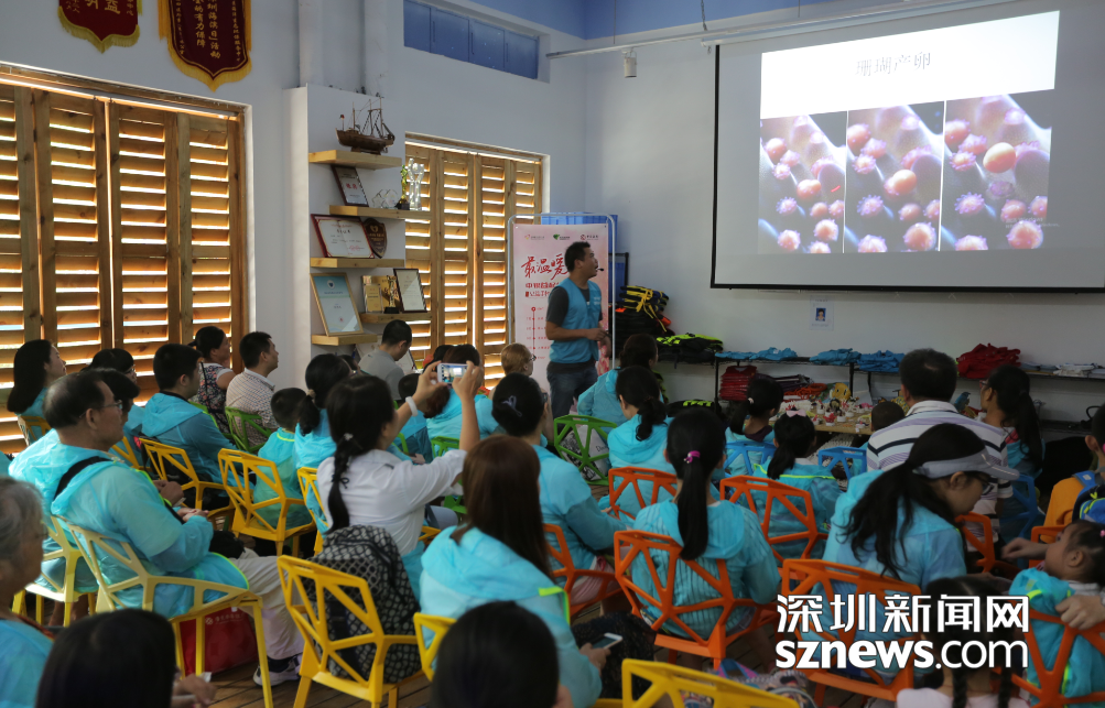 珊瑚蟲義工隊隊長鯊哥為來到海邊學習海洋環(huán)保知識的孩子們上課。
