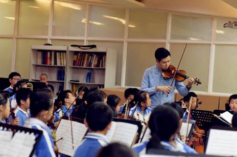 在王翔云成為丹堤實(shí)驗(yàn)學(xué)校的一員之后,就將自己投入到了弦樂(lè)團(tuán)的學(xué)生訓(xùn)練中,每天起早貪黑地和孩子們一起訓(xùn)練,甚至利用周末時(shí)間和孩子們待在一起練習(xí)。在和孩子共同努力下,丹堤實(shí)驗(yàn)學(xué)校的弦樂(lè)團(tuán)在2016年龍華新區(qū)學(xué)校藝術(shù)展演榮獲一等獎(jiǎng),在2016年廣東提琴文化藝術(shù)節(jié)青少年弦樂(lè)邀請(qǐng)賽中獲得銀獎(jiǎng)?!爱?dāng)然,這些成績(jī)的獲得也離不開學(xué)校的大力支持,離不開張國(guó)明教授等高人的指點(diǎn)。我認(rèn)為小學(xué)階段是人一生中形成德育和美育的重要時(shí)期。我們總會(huì)要求孩子們要形成良好的生活習(xí)慣,我認(rèn)為倒不如讓他們覺得我們現(xiàn)在做的每一件事都是正確的,有意義的,比如在我們的課堂和訓(xùn)練中,我就會(huì)要求他們將譜臺(tái)、椅子、琴盒、琴袋等擺放整齊,現(xiàn)在他們都可以自覺地完成?!?/p>