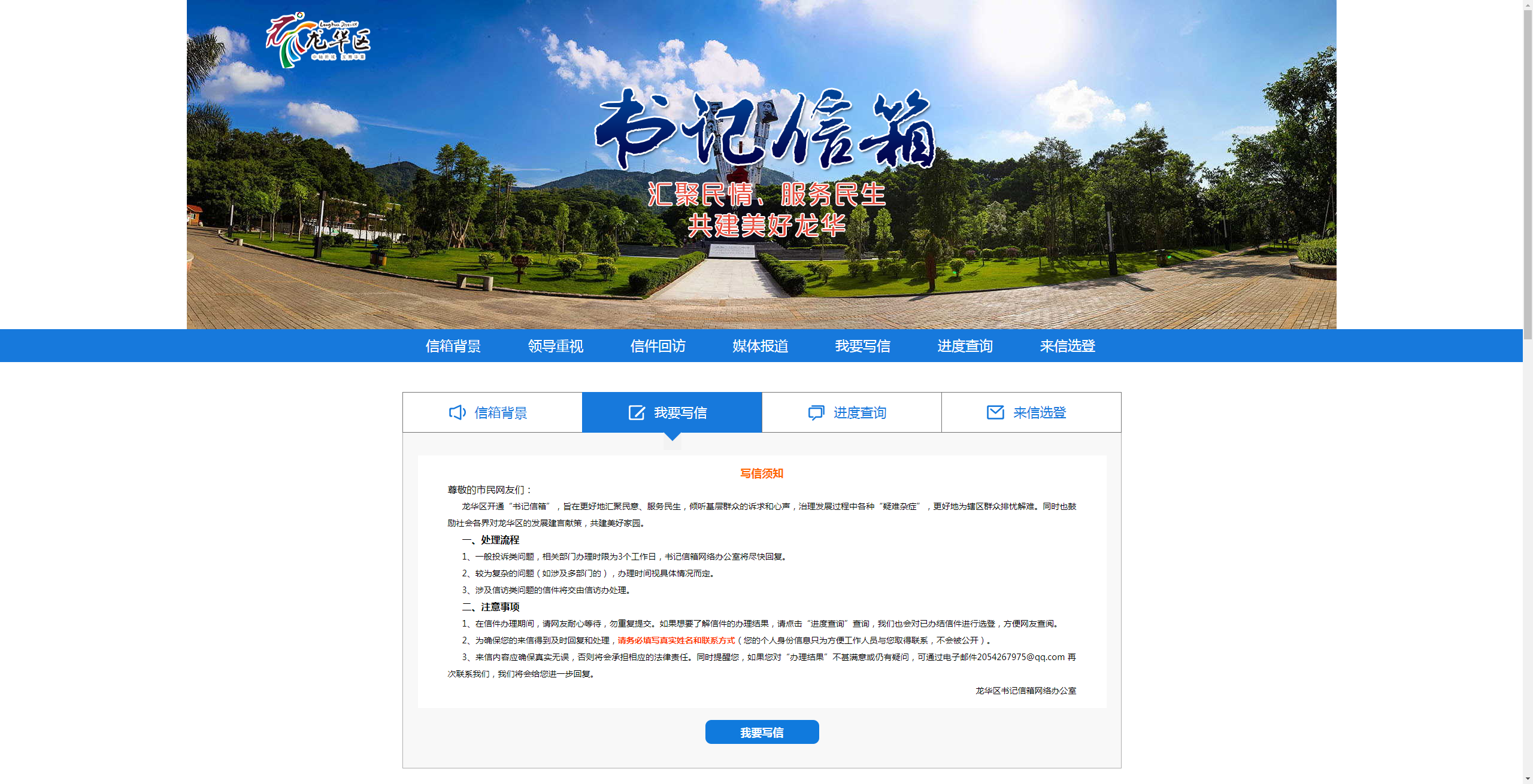 龍華區(qū)“書記信箱”網(wǎng)絡(luò)平臺(tái)是由龍華區(qū)領(lǐng)導(dǎo)的指導(dǎo)下搭建的網(wǎng)絡(luò)信息平臺(tái),由深圳新聞網(wǎng)團(tuán)隊(duì)進(jìn)行開發(fā)搭建?!皶浶畔洹钡臉?gòu)建,是龍華區(qū)委貫徹落實(shí)黨的群眾路線,踐行“三嚴(yán)三實(shí)”的一項(xiàng)新舉措?!皶浶畔洹弊?015年10月31日正式上線以來,逐步成為龍華市民向龍華區(qū)委反映、提出建議、意見和投訴請(qǐng)求的重要渠道。