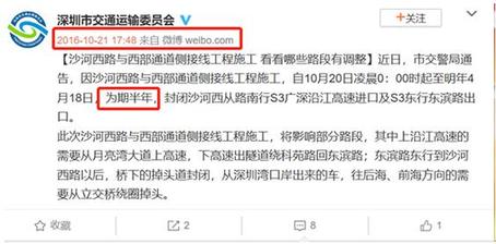據(jù)市交委于2016年10月21日發(fā)布的通告稱,沙河西路與西部通道側(cè)接線工程(即東濱路隧道匝道工程)的施工時(shí)間計(jì)劃為2016年10月20日凌晨0:00時(shí)起至2017年4月18日,為期半年。期間將封閉沙河西從路南行s3廣深沿江高速進(jìn)口及s3東行東濱路出口。