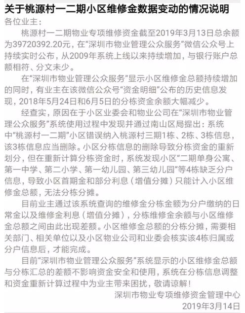 3月18日,南山區(qū)住房和建設(shè)局通過深圳論壇進(jìn)行公開回應(yīng),稱經(jīng)向市物業(yè)專項(xiàng)維修資金管理中心查詢,原因在于桃源村三期1棟、2棟、3棟信息刪除及分棟資金的重新劃分,以致小區(qū)首期維修金和部分利息(增長(zhǎng)分?jǐn)偅┲荒苡?jì)入小區(qū)維修金總額,無(wú)法分棟分?jǐn)偂?/span>