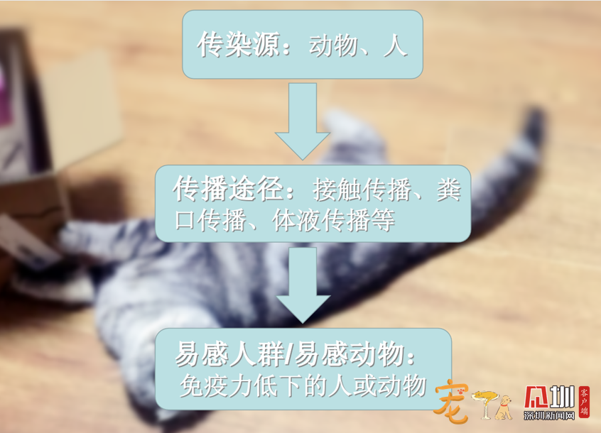 一般來說,人寵共患病可以分為3個基本環(huán)節(jié):傳染源、傳播途徑及易感人群(或易感動物)。