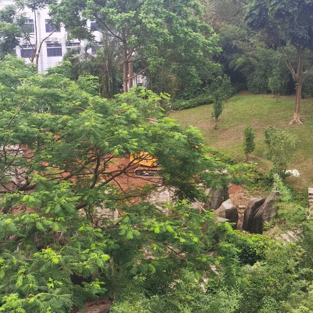 其次,從今年7月起,在二層架高平臺之上的山坡綠地,存在樹木砍伐和綠地草坪遭毀壞的情況,且有挖掘機開入并停泊,而現(xiàn)場也沒有任何工程信息和告示。