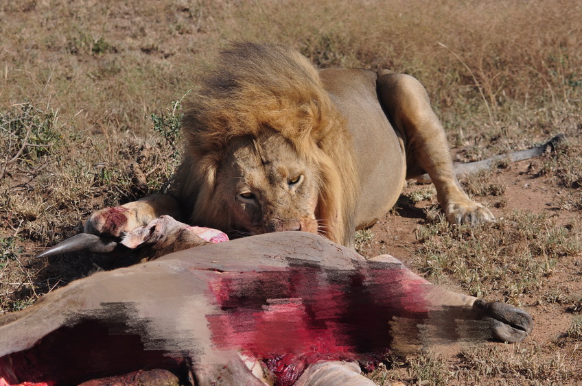 雄獅趴在被咬死的大羚羊旁。李仁奇 攝
