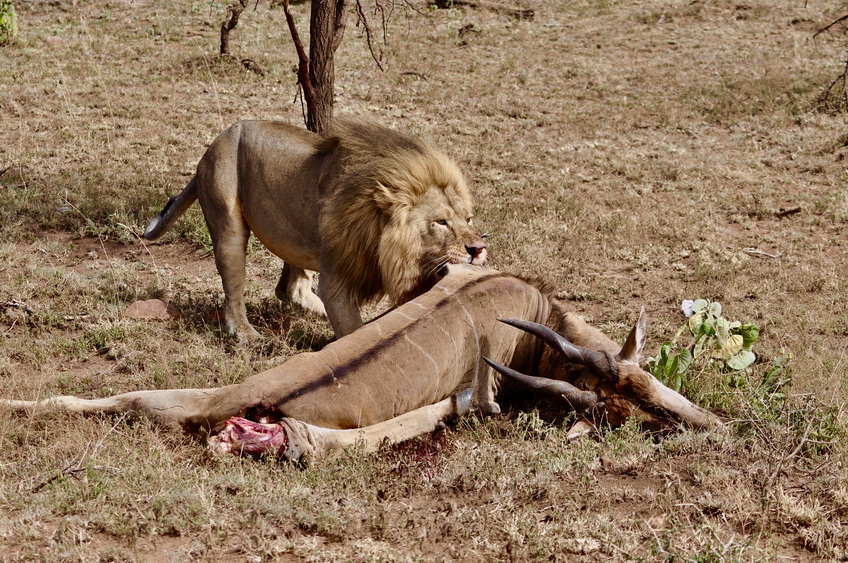 這頭估計(jì)重達(dá)二、三百斤的大羚羊是早晨被三頭雌獅捕獲的,雄獅趕到后,雌獅們各自撕扯一塊肉到遠(yuǎn)處享用去了。雄獅腹中饑餓,不顧乘坐兩臺(tái)越野車(chē)的十位游客近在咫尺,只管用力撕咬拖拽羚羊尸體。李仁奇 攝